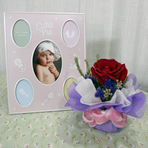 items: - Baby Photo Frame (pink) - Red Rose Standing Bouquet
